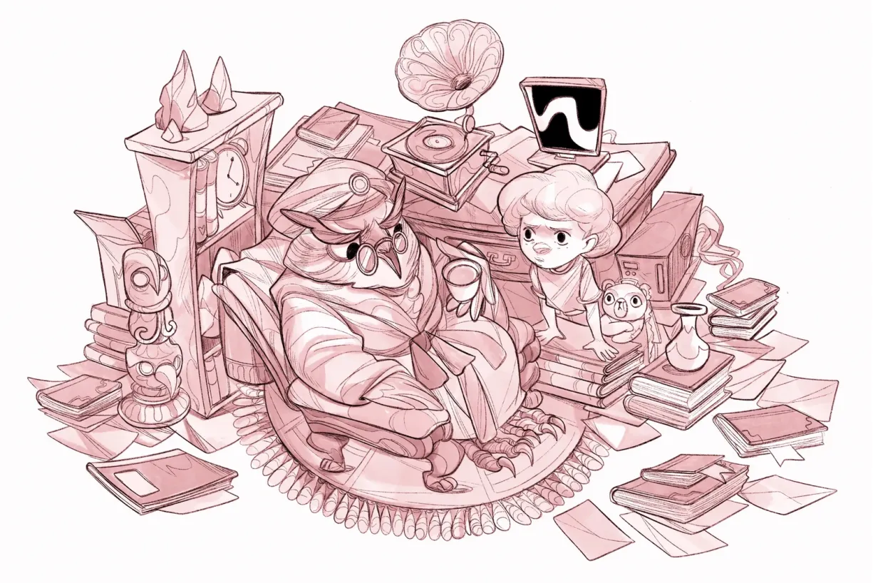 Madam Owl’s home is both chaotic and comforting: a hoarder’s nest of books, trinkets, clocks, and half-forgotten systems. It’s a mess, but a lived-in mess. A place where rules are bent, not broken—just hard to find under all the clutter.
