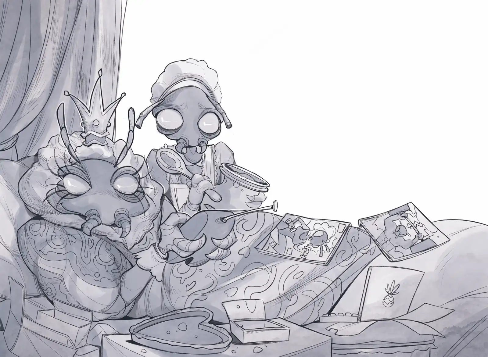This scene offers a deliciously absurd re-encounter with the world of Antazonia. Unlike the tense political underground of Book I, we now find a realm run by a Queen who spends her days reclined on candy-strewn cushions, glued to violent computer games and spoon-fed chocolate cream. Her royal chamber resembles a gamer’s cave, her subjects mere background noise.