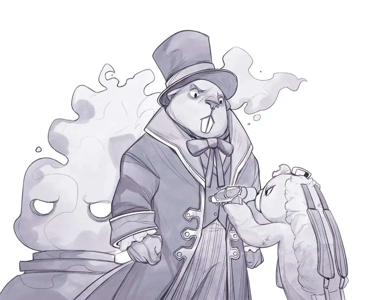 “Stop!” screamed a small voice — and right under Heino’s nose appeared Pouchy, armed with two pistols aimed straight at the beaver’s fat belly. Apparently, she hadn’t been caught in the net like the others and had been hiding in the dark all along. “Make one move and you’re dead! Hands up — and don’t you dare say a word!”